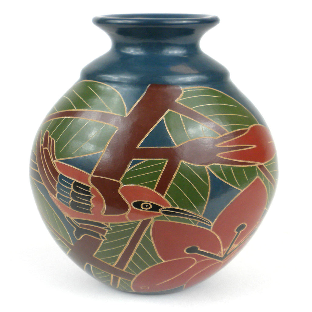 This decorative vase from Nicaragua is 8 inches tall and 5 inches in diameter, featuring a red bird and flower design. This is low fired and not designed to hold water.